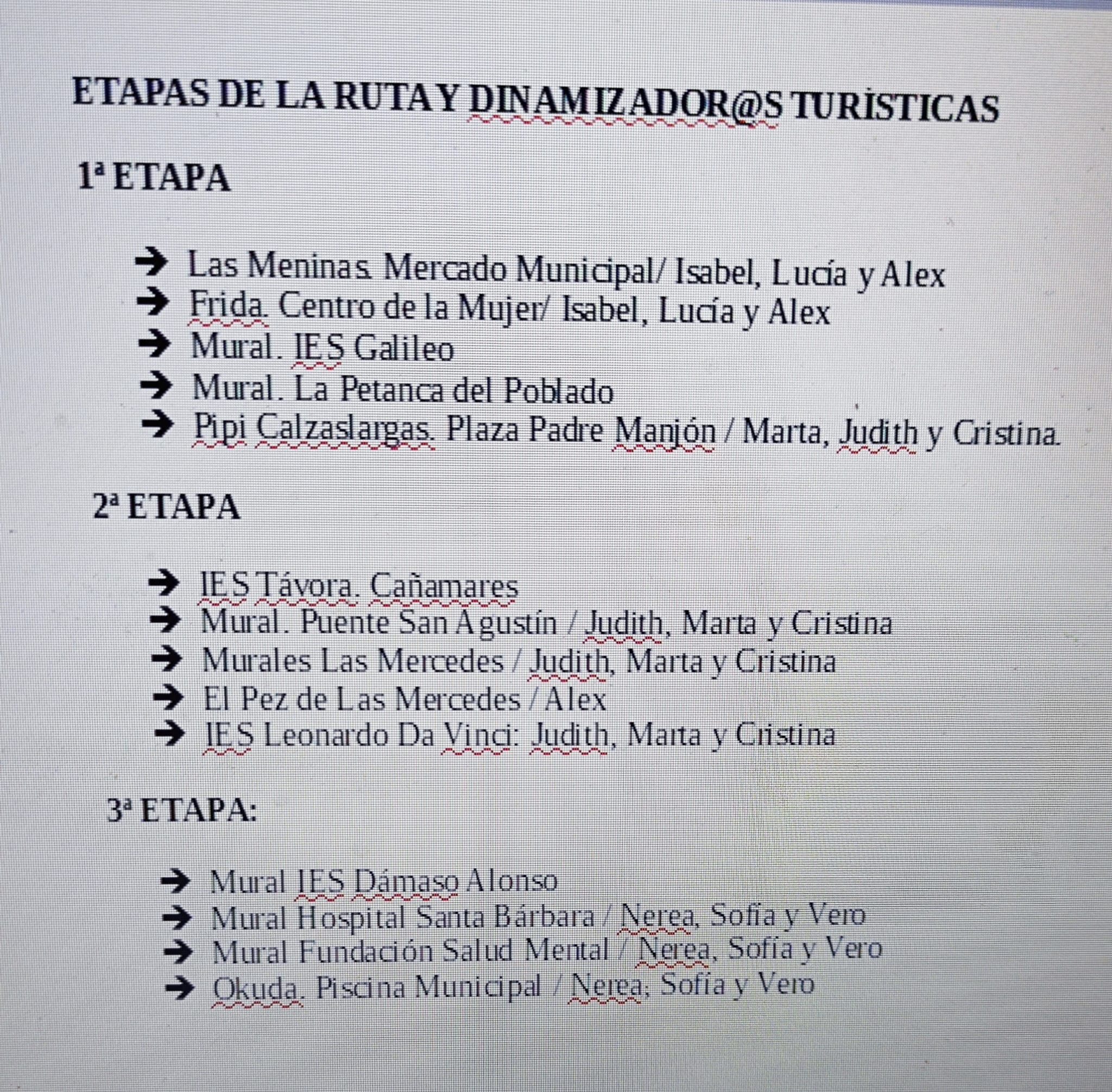 Etapas de la ruta y dinamizaciones que tendran lugar a lo largo de las 3 semanas que durara la actividad.
